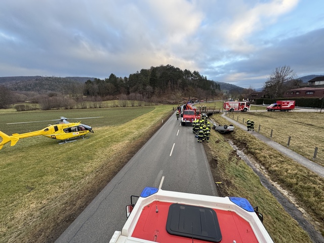Nach eigenen Angaben wurde der Fahrer eines PKW durch den Gegenverkehr zum Ausweichen genötigt. Dabei rutschte das Fahrzeug über die Böschung der B11 in den Graben zum Nöstachbach. Dort überschlug sich das Fahrzeug und blieb auf dem Dach liegen.